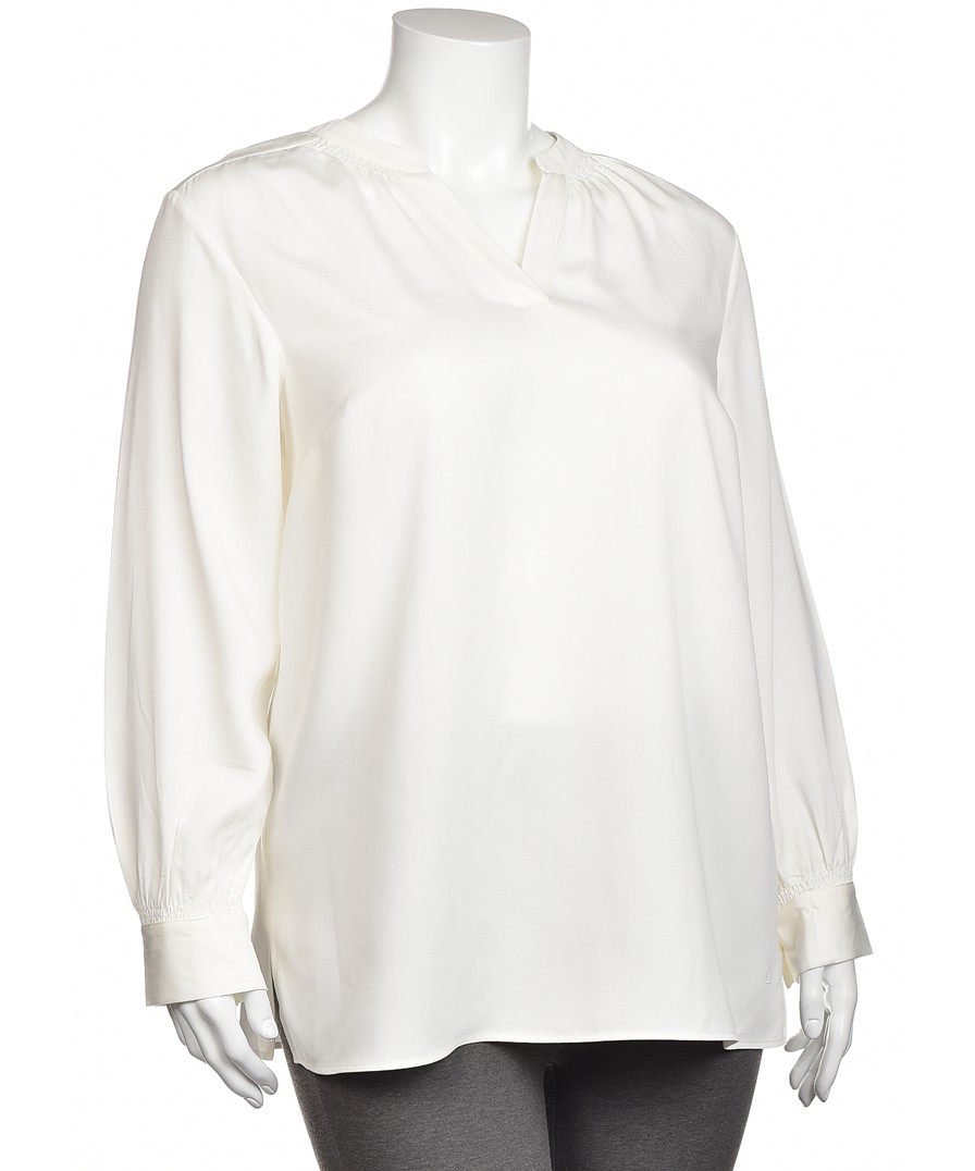 Елегантна дамска блуза от лиосел в кремаво-бял тон. Свободен силует, деликатен V-образен деколте, дълги ръкави с маншет, мек и дишащ материал за комфорт през целия ден. Лесна грижа, подходяща за деня.