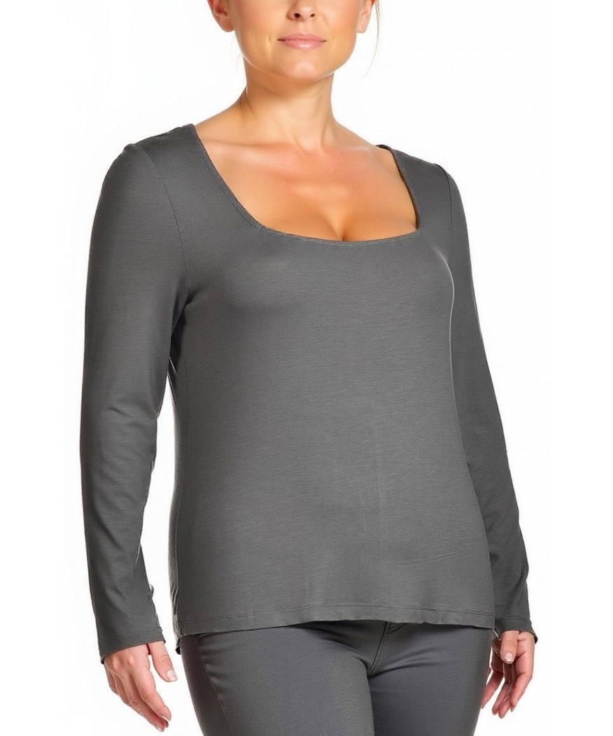 Елегантна дамска блуза от вискоза в антрацит. Дълги ръкави, квадратно деколте и изчистен силует. Мека, дишаща, леко еластична, подходяща за офис и ежедневни визии. Подчертайте с бижу елегантни обувки.