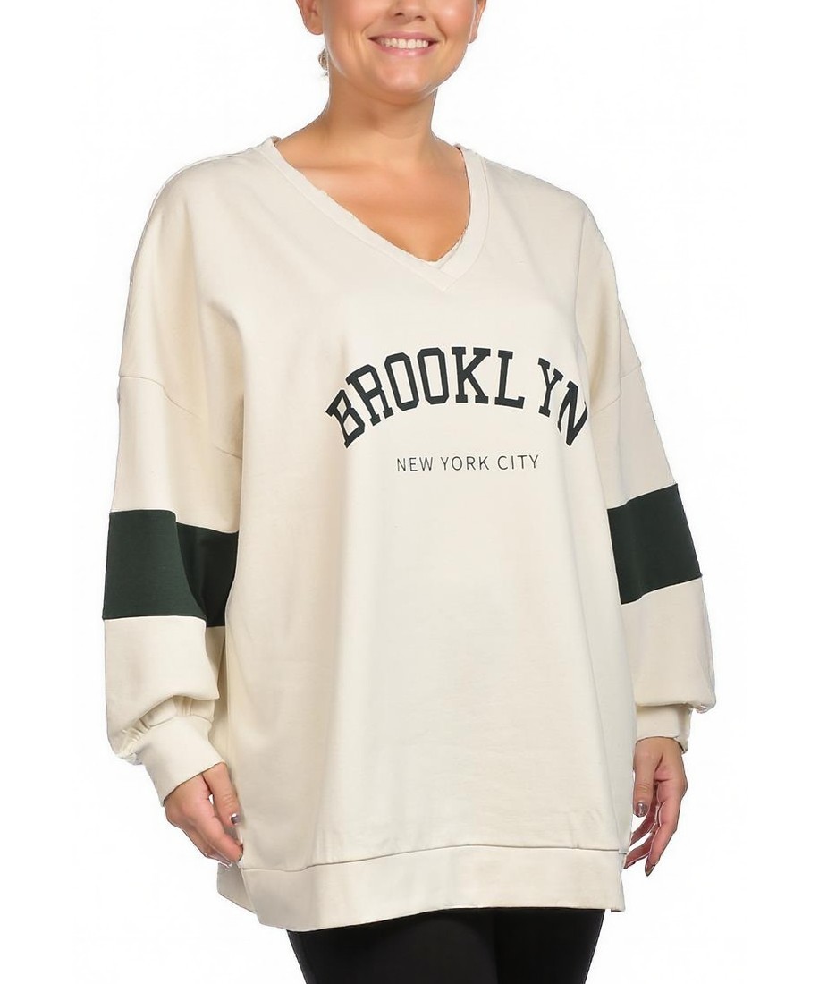 Дамска памучна блуза в oversize силует с V-образно деколте, спортни ръкави с тъмнозелени ленти и принт "BROOKLYN". Мека, дишаща и удобна за ежедневие, комбинира се лесно с дънки. Винаги стилна. S-XL.
