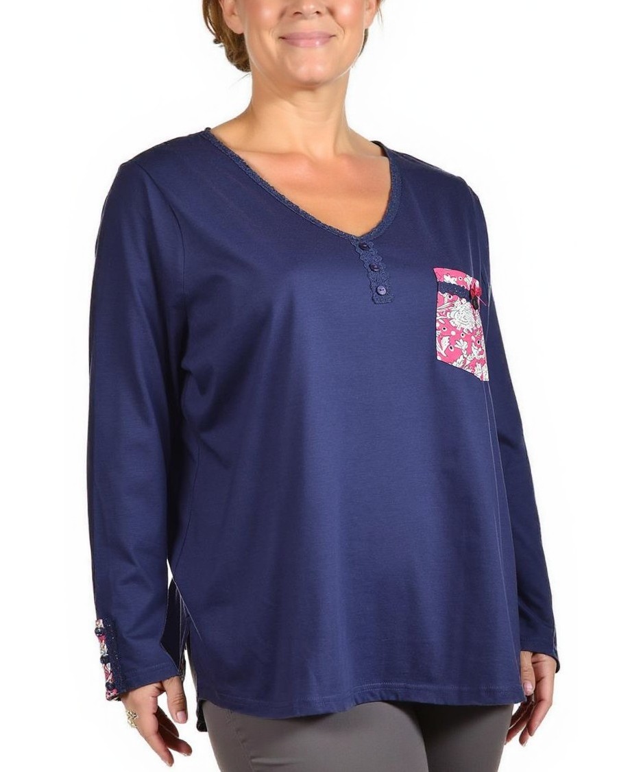 Дамско горнище на пижама от мек памук. Тъмносин цвят, дълъг ръкав и V-образно деколте с копчета. Свободна кройка за комфорт. Декоративен флорален джоб и детайл на маншета. Подходящо за уют и сън. Лек.