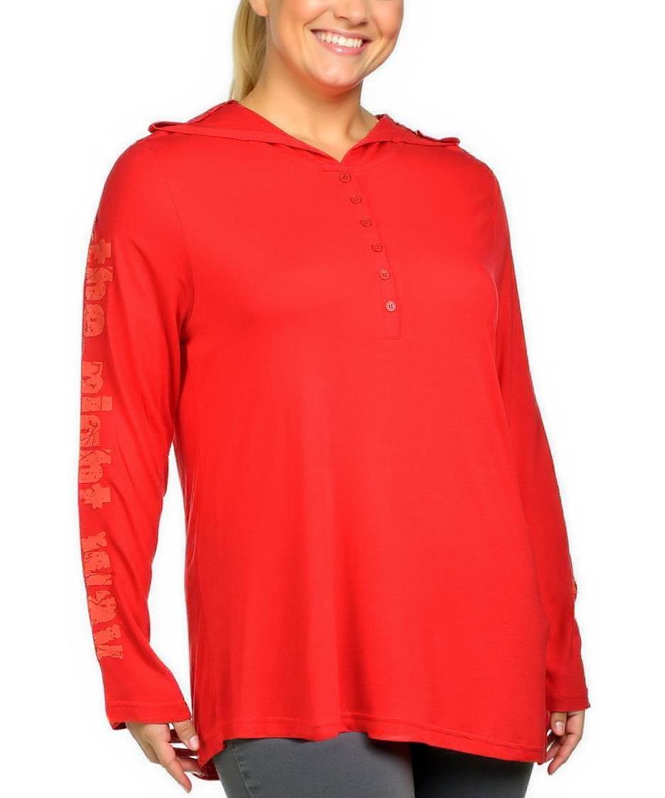 Дамска блуза от вискоза, в ярък червен цвят. С дълги ръкави и качулка, украсена с надпис на единия ръкав. Подходяща за ежедневно облекло, съчетава комфорт и стил с модерен дизайн.