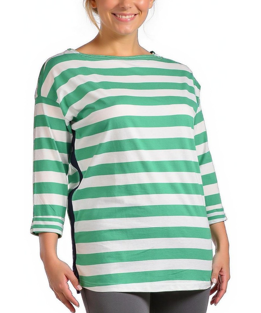 Дамска блуза от памук с широки хоризонтални райета в зелено и бяло. Моделът е с 3/4 ръкави и свободен силует, подходящ за ежедневни аутфити. Блузата осигурява комфорт и стил, идеална за всякакви поводи.