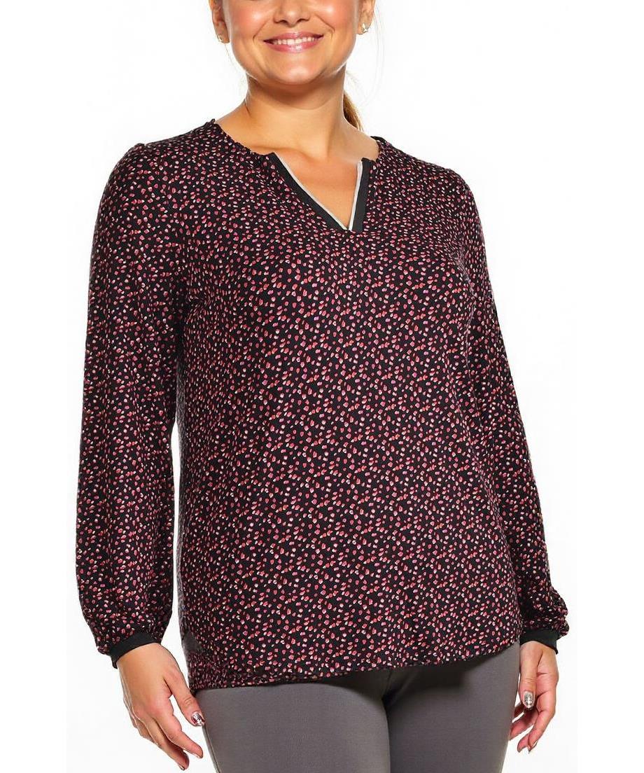 Елегантна дамска блуза от вискоза с деликатен розово-черен десен. Свободна, с V-образно деколте, дълги ръкави с ластични маншети и фини кантове. Комфортна и стилна за всеки ден и офис. Лесна поддръжка
