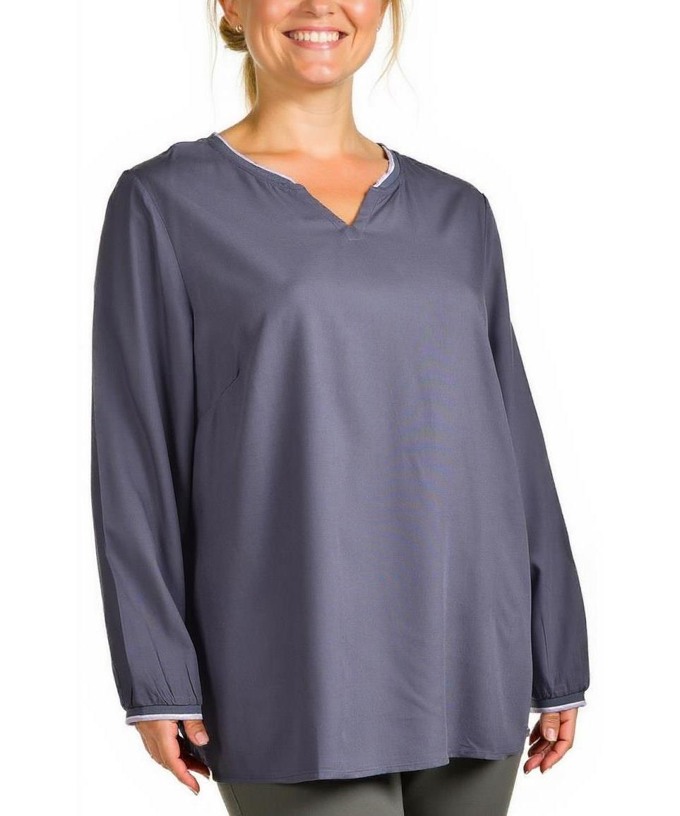 Лека дамска блуза от вискоза в сиво-лавандерено. Свободен силует, дълъг ръкав с маншет, деколте тип V с деликатен кант. Удобна и елегантна за всеки ден. Подходяща за работа, срещи и свободно време. XS