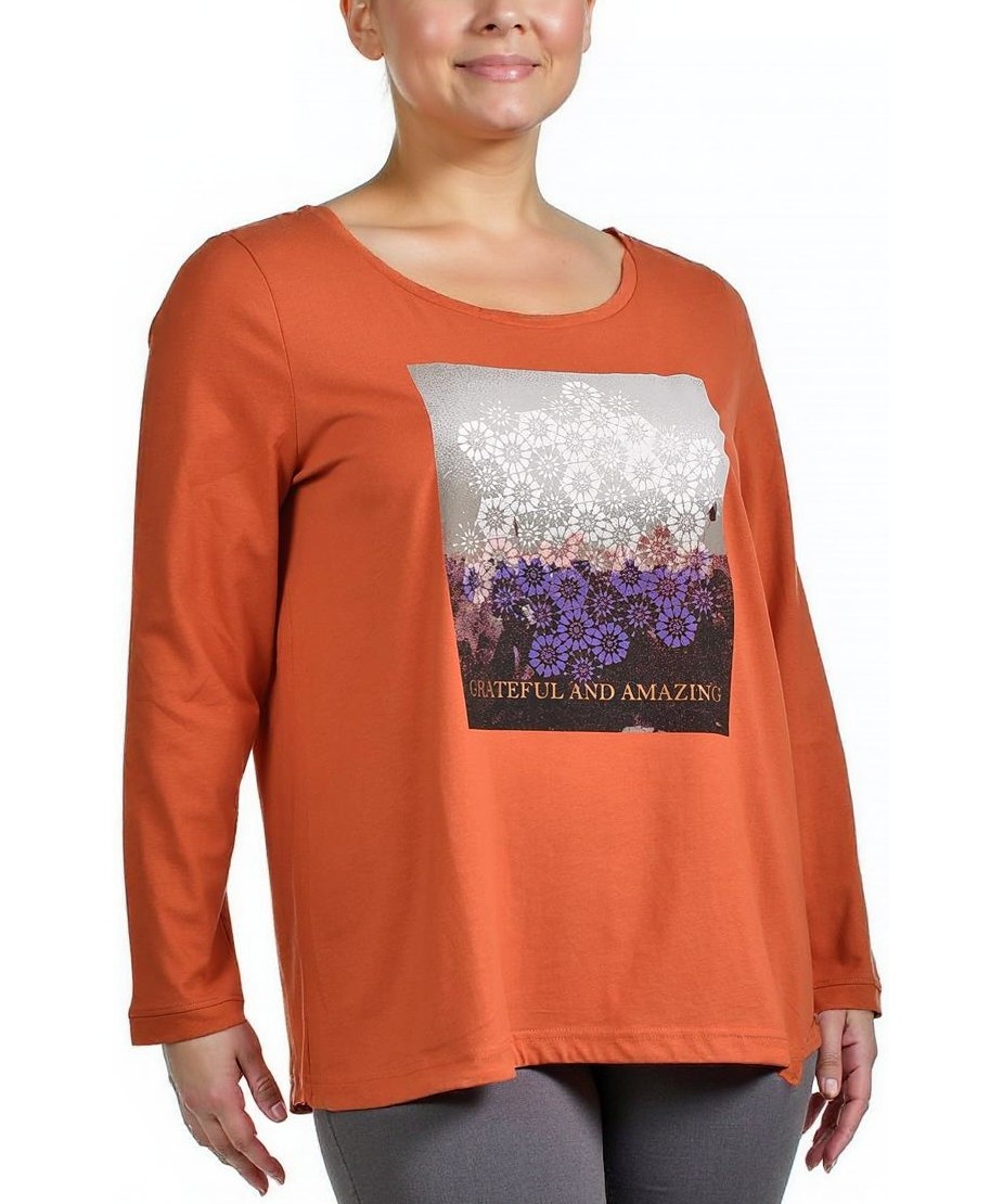 Дамска блуза от мек памук в топъл керемиден нюанс. Свободна кройка с дълъг ръкав и обло деколте. Отпред има принт с градиентни цветя и надпис "Grateful and Amazing". Удобна за ежедневие. Лека и удобна