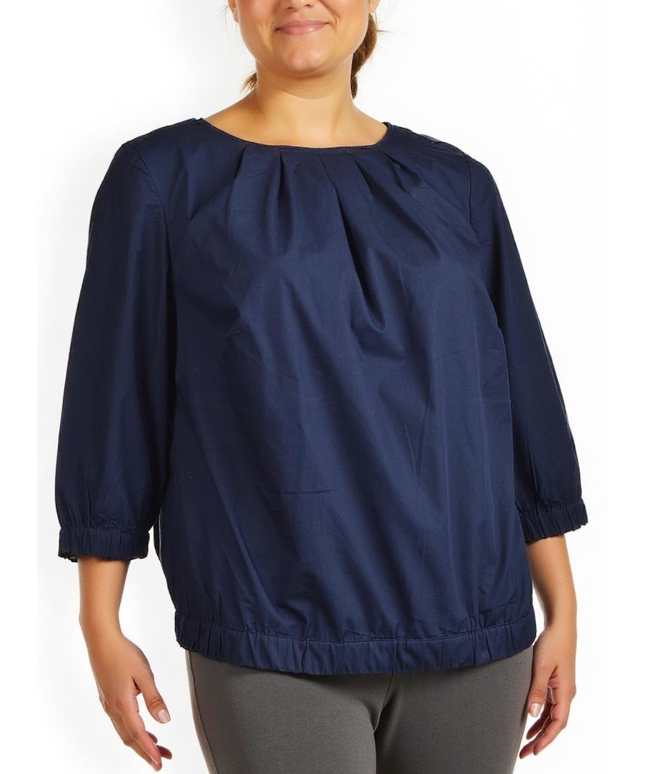 Елегантна дамска блуза от 100% ПАМУК в тъмносин цвят. Свободна кройка, обло деколте с меки гънки. Ръкав 3/4 с ластични маншети, ластик в подгъва. Лекичка, дишаща и удобна за всеки ден. Идеална за деня