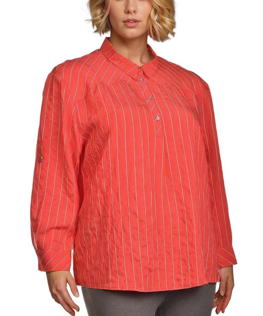 Дамска блуза от вискоза в червен цвят с вертикални райета. Има класическа якa и половин закопчаване отпред с копчета. Ръкавите са дълги с възможност за навиване и фиксиране с копче. удобна и стилна за ежедневието.