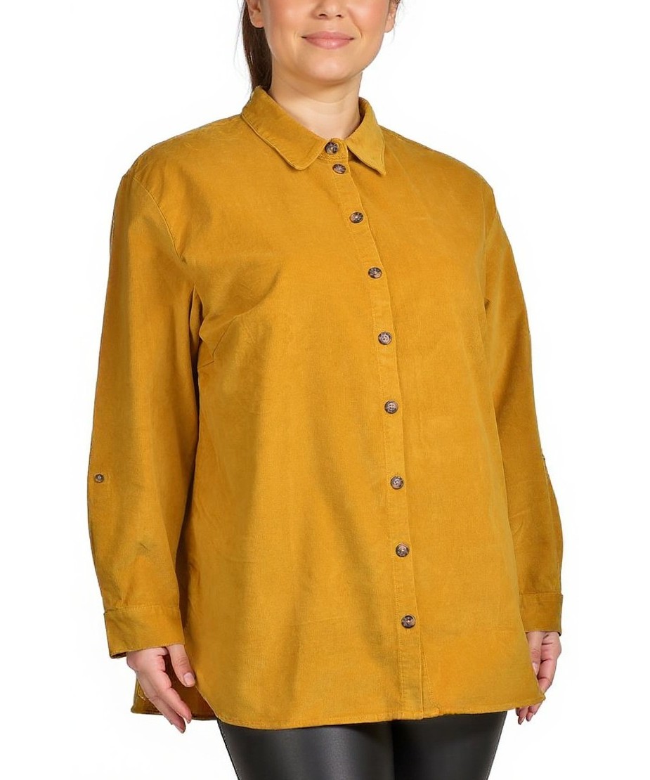 Дамска памучна риза в горчичен цвят, с яка, копчета по цялата предница и дълги ръкави. Свободна, удобна кройка за ежедневни и елегантни комбинации, лесна за поддръжка. Подходяща за преходните сезони.