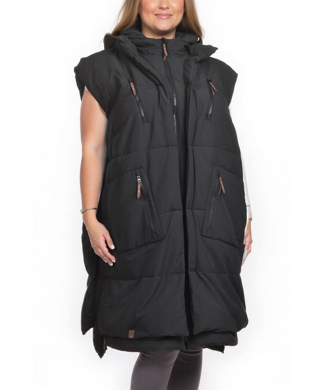 Удължена дамска грейка без ръкави с качулка и двупосочен цип. Пухена, топла и удобна, с практични джобове с цип и модерна силуетна кройка, идеална за студените есенни и зимни дни. Лесна за поддръжка!!