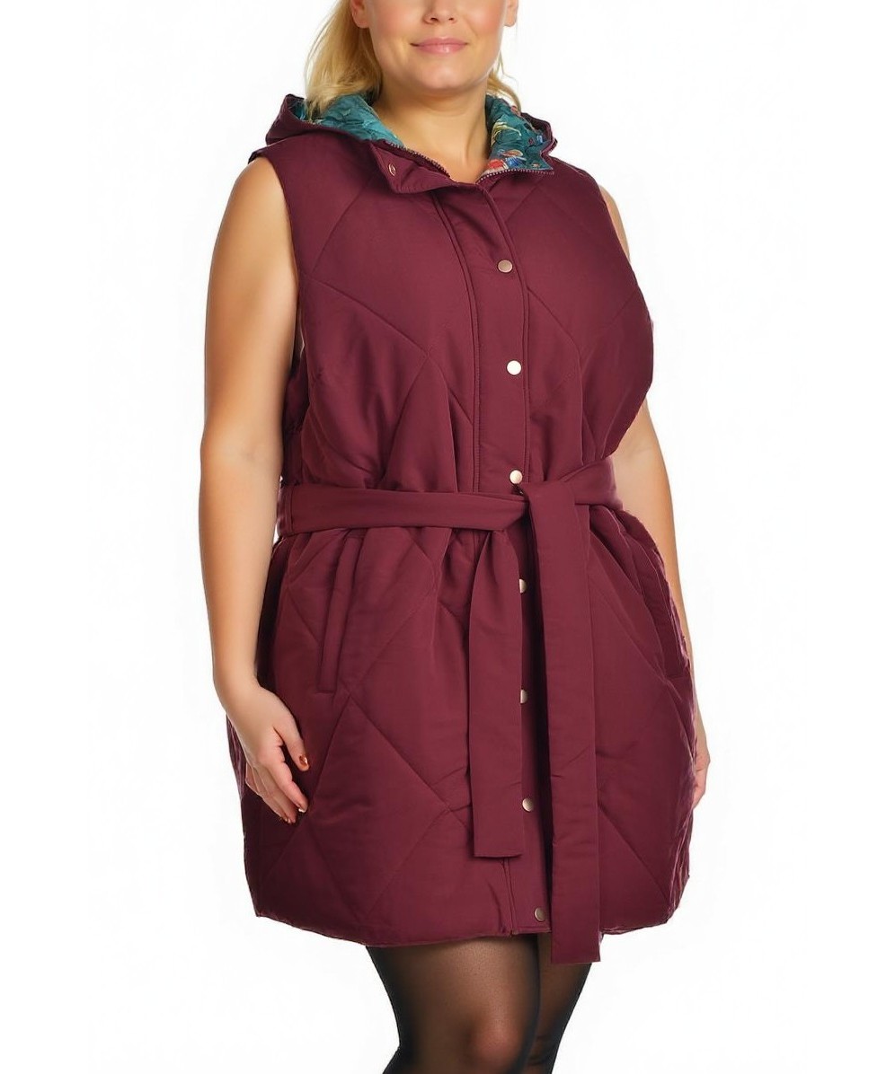 Елегантна дамска грейка в бордо, без ръкави, с качулка и колан. Ватирана, топла и удобна, с джобове и закопчаване с копчета. Съвременен силует за комфорт и стил в студените дни Подходяща за всеки ден