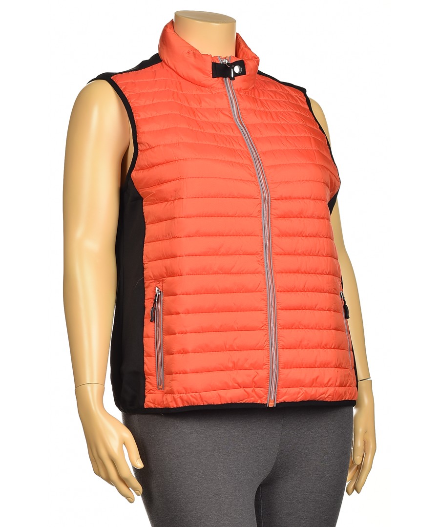 Дамска грейка с ярко оранжев преден панел и черни странични панели. Има преден цип и два странични джоба с ципове. Подходяща за есенни и пролетни дни, предлага комфорт и стил.