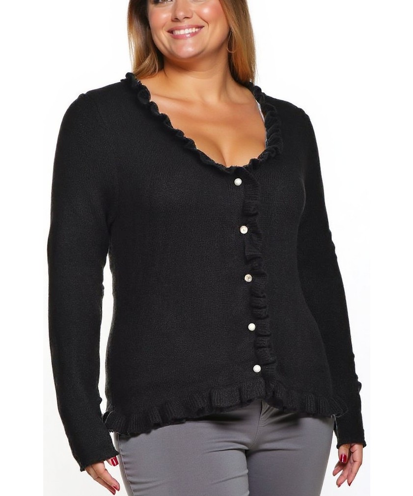 Елегантна дамска жилетка в черно с V-образно деколте, дълги ръкави и пераловидни копчета. Декоративни къдрици по деколтето и долния ръб за фин женствен акцент. Подходяща за ежедневие и официални поводи