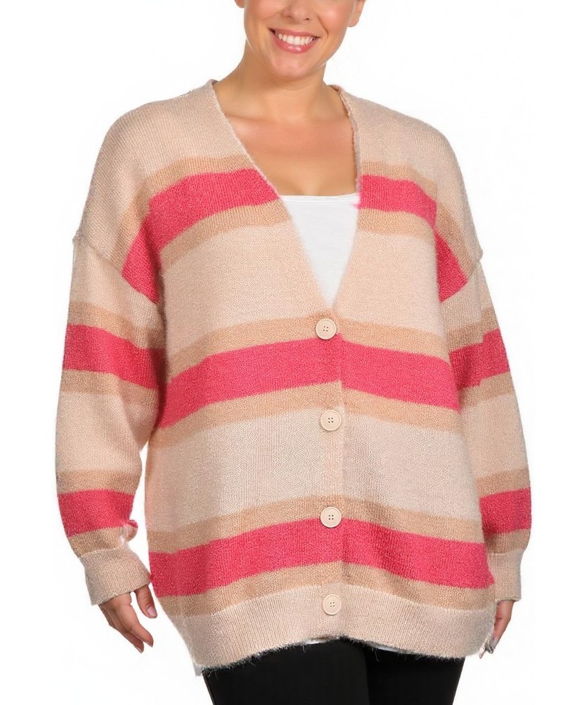 Дамска жилетка с широк силует, V-образно деколте и големи копчета. Мека, пухкава плетка с хоризонтални райета в прасковено, бежово и коралово. Удобна, топла и стилна за ежедневието. перфектна за вечерни