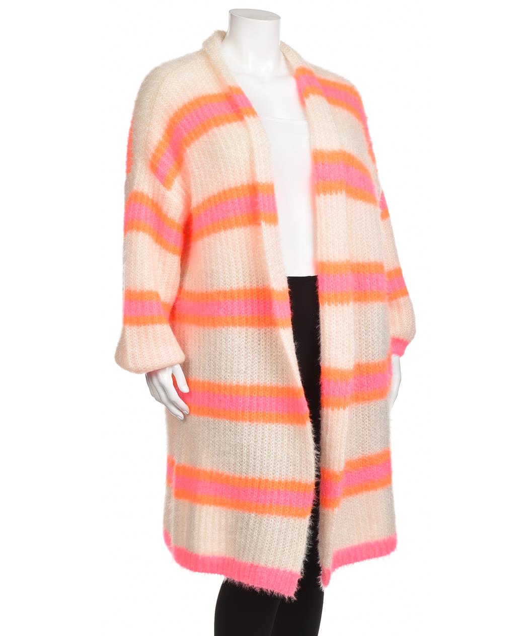 Дълга дамска жилетка в свободен силует, плетена от мохероподобна материя. Кремава основа с ярки розово-оранжеви райета, отворен преден край, топла и стилна за ежедневие и слоеве. Идеална за прохлада.