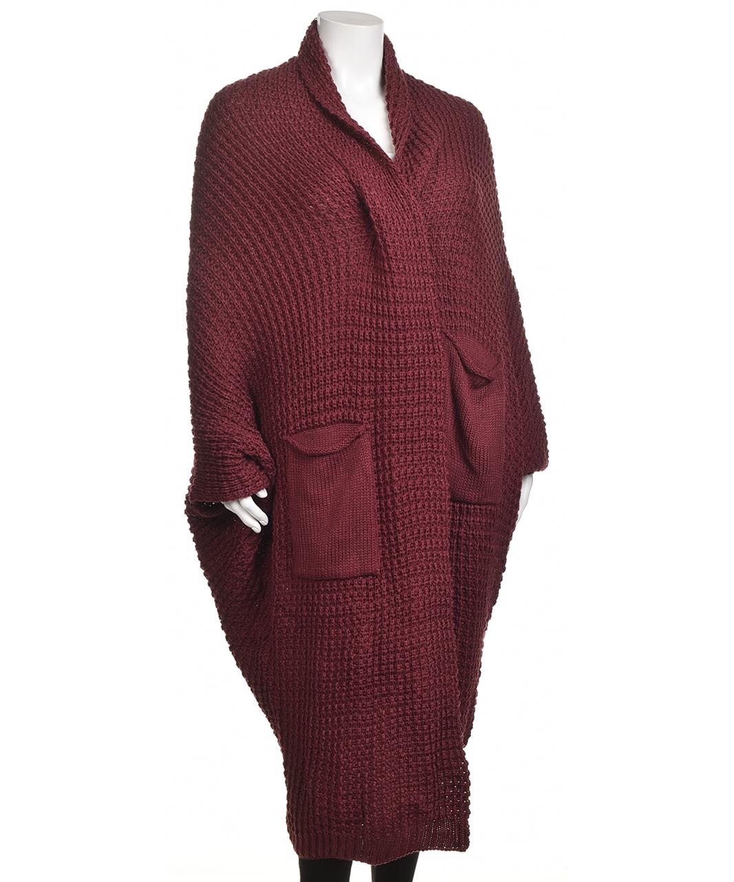 Дълга дамска жилетка в цвят бордо, плетена с обемна текстура. Оувърсайз кройка, шал яка, два джоба и свободни ръкави. Топла, стилна и удобна за ежедневие и преходни сезони. Машинно пране, универсален.