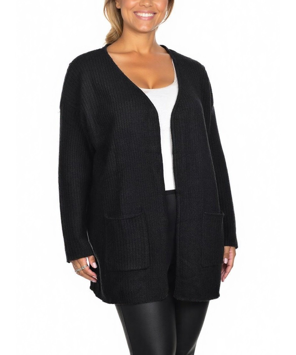 Черна дамска жилетка с отворен преден край, дълъг силует и джобове. Мека, плетена структура, свободна кройка за комфорт и стил. Универсална за ежедневно и официално облекло. Комфортна, лесна за поддръжка.