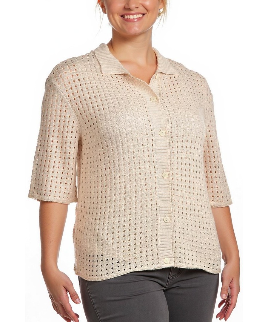 Елегантна дамска жилетка от памук в неутрален бежов тон. Характеризира се с рязан, дишащ плетен десен, къс ръкав и копчета отпред. Лека и удобна за всеки ден през пролет-лято. Подходяща за всеки повод.