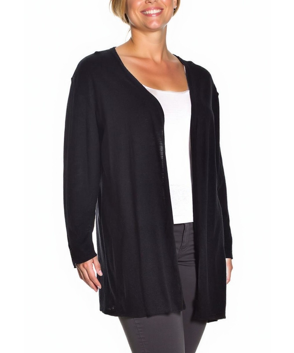 Дамска памучна жилетка в черно с отворен преден силует и дълги ръкави. Мека, дишаща и еластична, перфектна за ежедневно носене и лесно комбиниране в всеки гардероб. Подходяща за машинно пране и сушене.