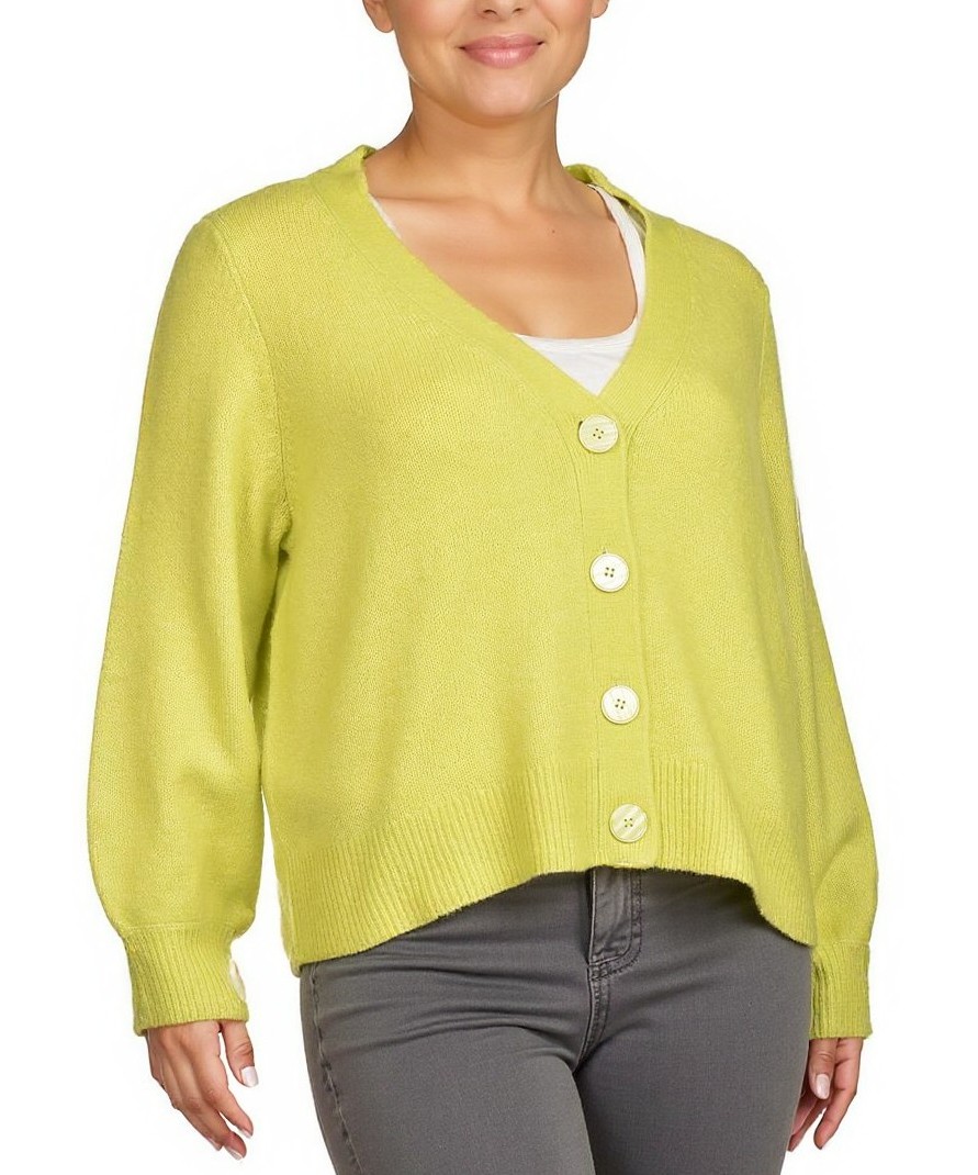 Дамска жилетка от вълна, в свеж лимоненожълт цвят, с копчета отпред. Има класически V-образно деколте и дълги ръкави. Перфектна за всекидневно носене или като акцент към всяко облекло.