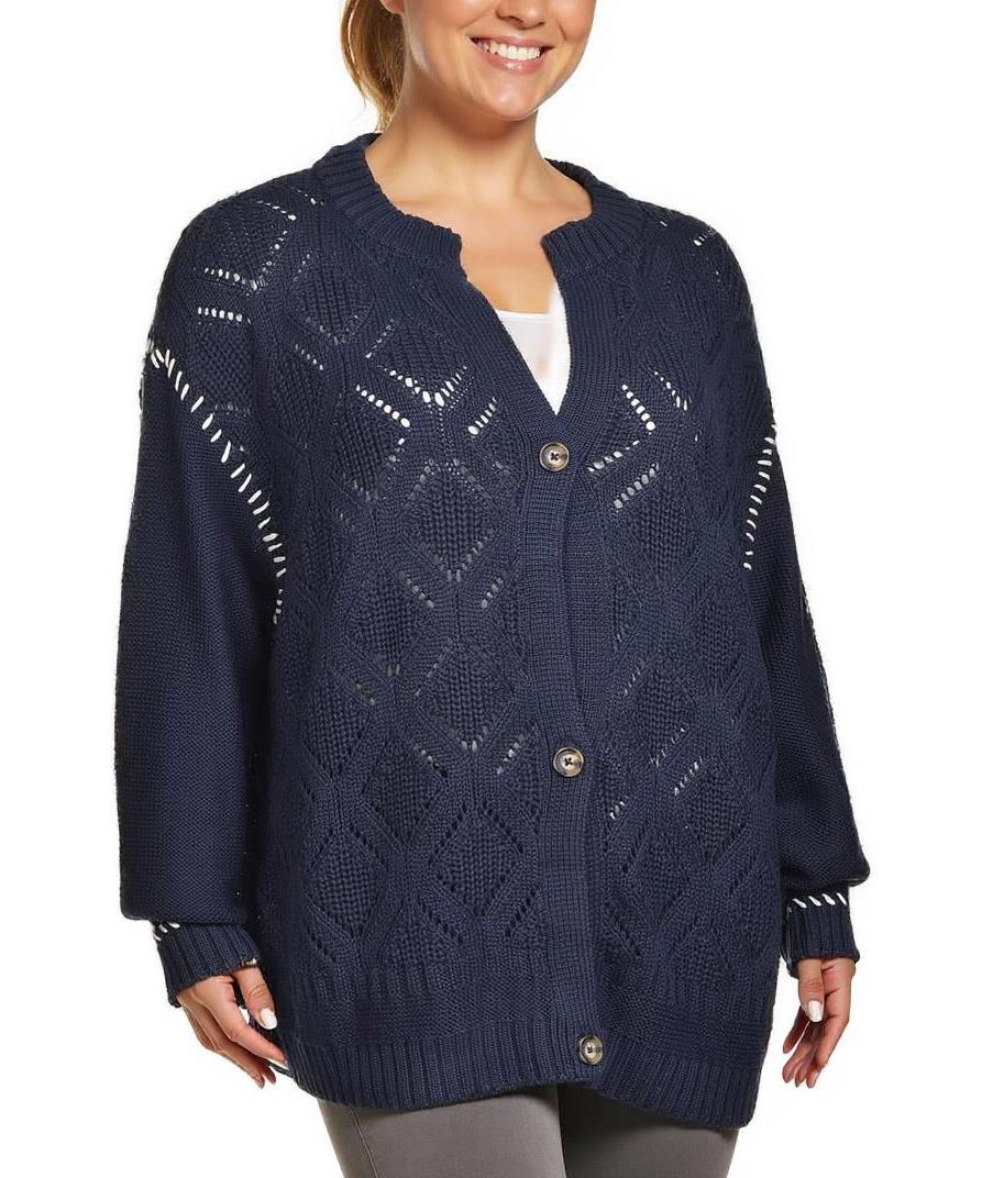 Мека дамска жилетка от 100% памук в тъмносин цвят. Оувърсайз кройка с ефектна ажурна релефна плетка, големи копчета и рипсен завършек. Дишаща, удобна и стилна за ежедневие. Подходяща за пролет и есен.
