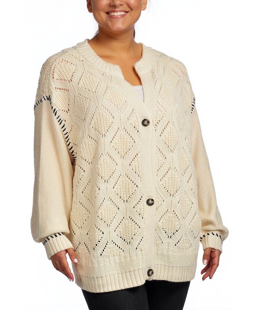 Дамска жилетка от памук в кремав цвят. Оверсайз кройка с ажурен ромбоиден плетен мотив, дълги ръкави, рипс ластик и три големи копчета. Мека, дишаща и удобна за всеки ден. Подходяща за пролет и есена.
