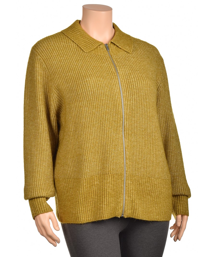 Дамска жилетка в горчичен цвят, плетена с цип и класическа яка. Свободен силует, широки ръкави и ластична подплата при ръкавите и долната част. Топла, удобна и стилна за всеки ден. Лесна за поддръжка.