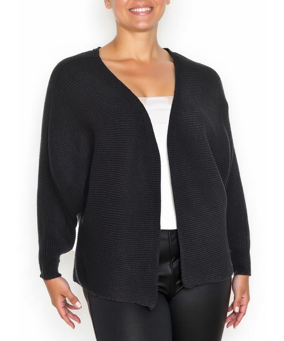 Елегантна дамска жилетка в черно, от мека плетена материя. Свободен, отворен модел с дълги ръкави и релефна структура — идеална за ежедневно и елегантно комбиниране. С джобове, за офис и свободно време