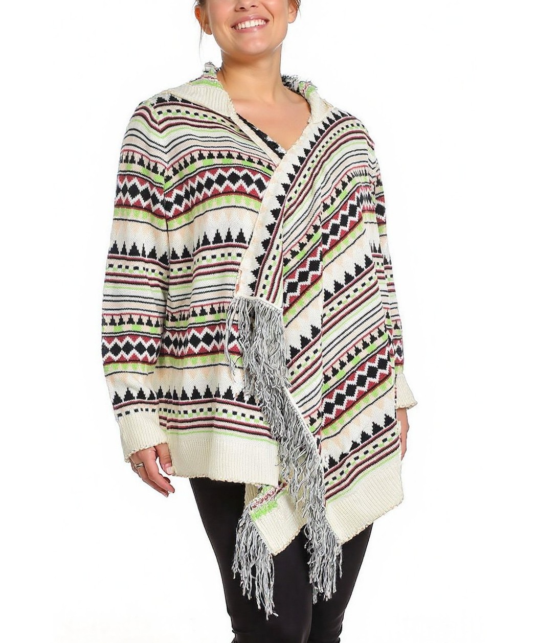 Плетена дамска жилетка-манто с етно геометричен десен в крем, черно, червено и зелено. Свободен силует, дълги ръкави, рипсени маншети, декорация с ресни и уютна качулка. Подходяща за есен и зима XXL.!