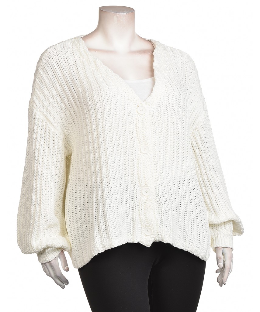 Дамска памучна жилетка в екрю: мека, плетена с релефни ивици, свободна оувърсайз кройка, V-деколте и копчета отпред. Удобна и стилна за всекидневно носене и лесно комбиниране.