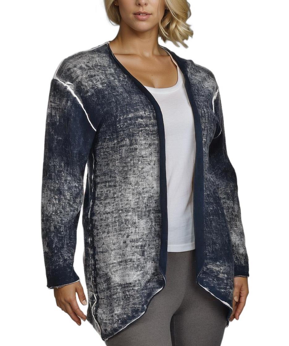 Модерна дамска жилетка, изработена от висококачествен памук. Дизайнът е с ефект на избеляло, с отворен преден край и дълги ръкави. Подходяща е за ежедневно носене, осигурява комфорт и стил.