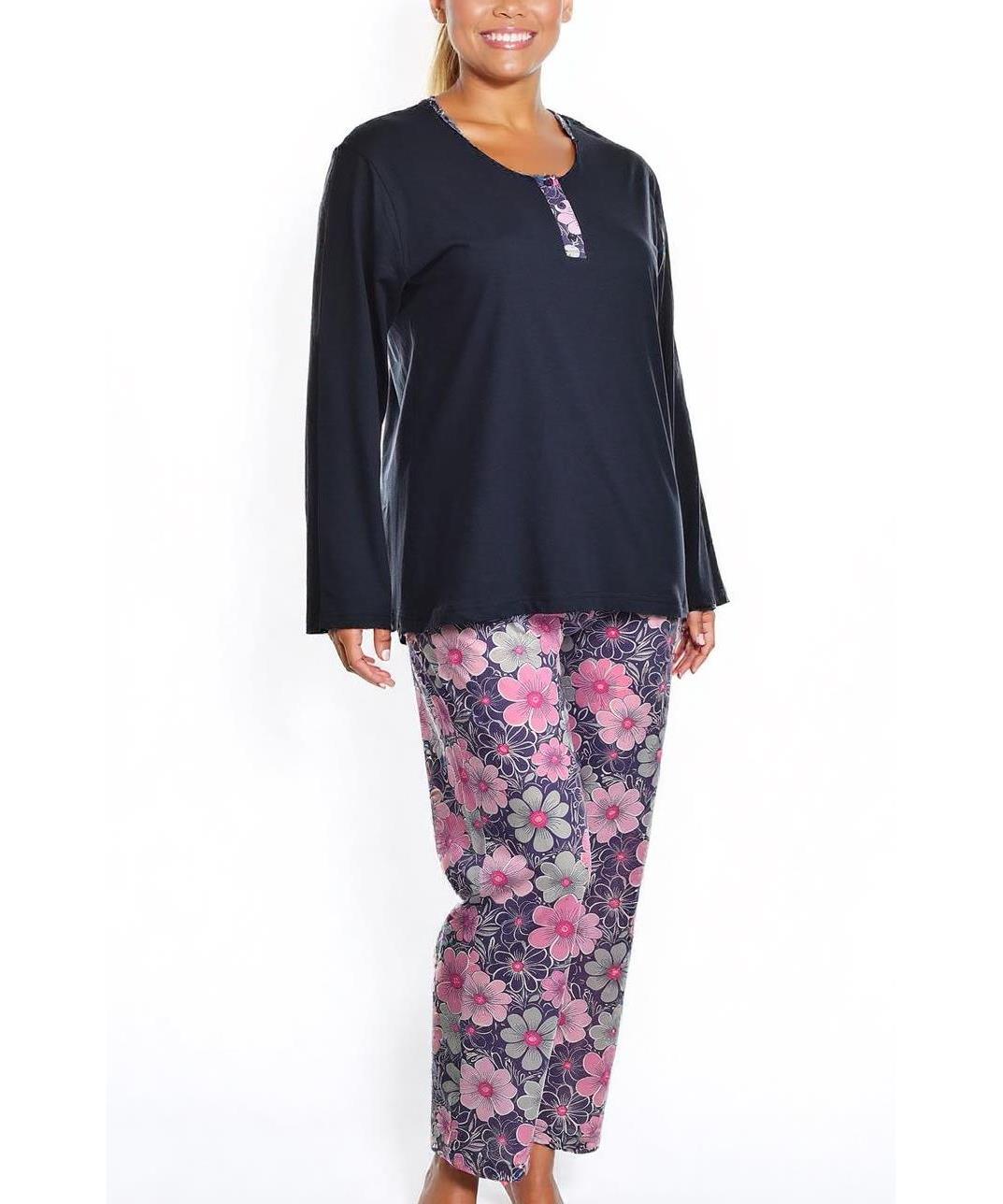 Дамска памучна пижама с тъмносиня блуза с дълъг ръкав и декоративно закопчаване на деколтето и панталон с розови флорални мотиви. Мека, дишаща и удобна за сън и почивка. Лесна поддръжка, размери S-XL.
