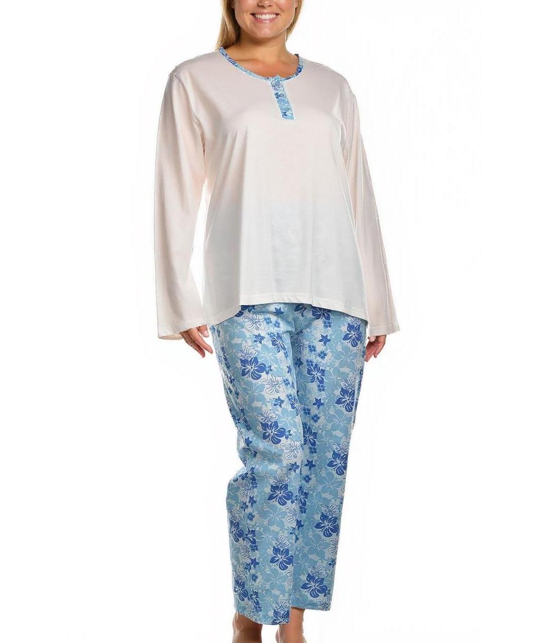 Дамска пижама от мека памучна материя: бяла свободна блуза с дълги ръкави и светлосини панталони с флорален принт. Комфортна и дишаща, идеална за спокойна и стилна нощ. Пране: машинно, лесна поддръжка