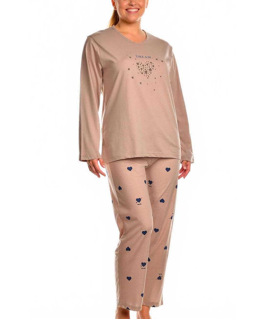 Дамска пижама от 100% памук в нежно бежово. Дълъг ръкав и прав панталон с тъмносини сърца. Мека, дишаща и удобна кройка за спокоен сън. Лесна грижа и идеална за подарък. Перфектна за домашен релакс.!!
