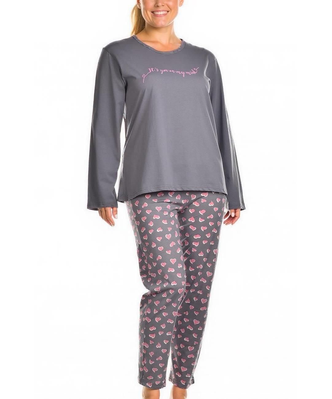 Дамска пижама от мек памучен микс, с дълъг ръкав и свободна кройка. Сив топ с нежна розова декорация и панталон със сладки розови сърца. Комфортна и стилна за дома и съня. Подходяща за подарък и пране