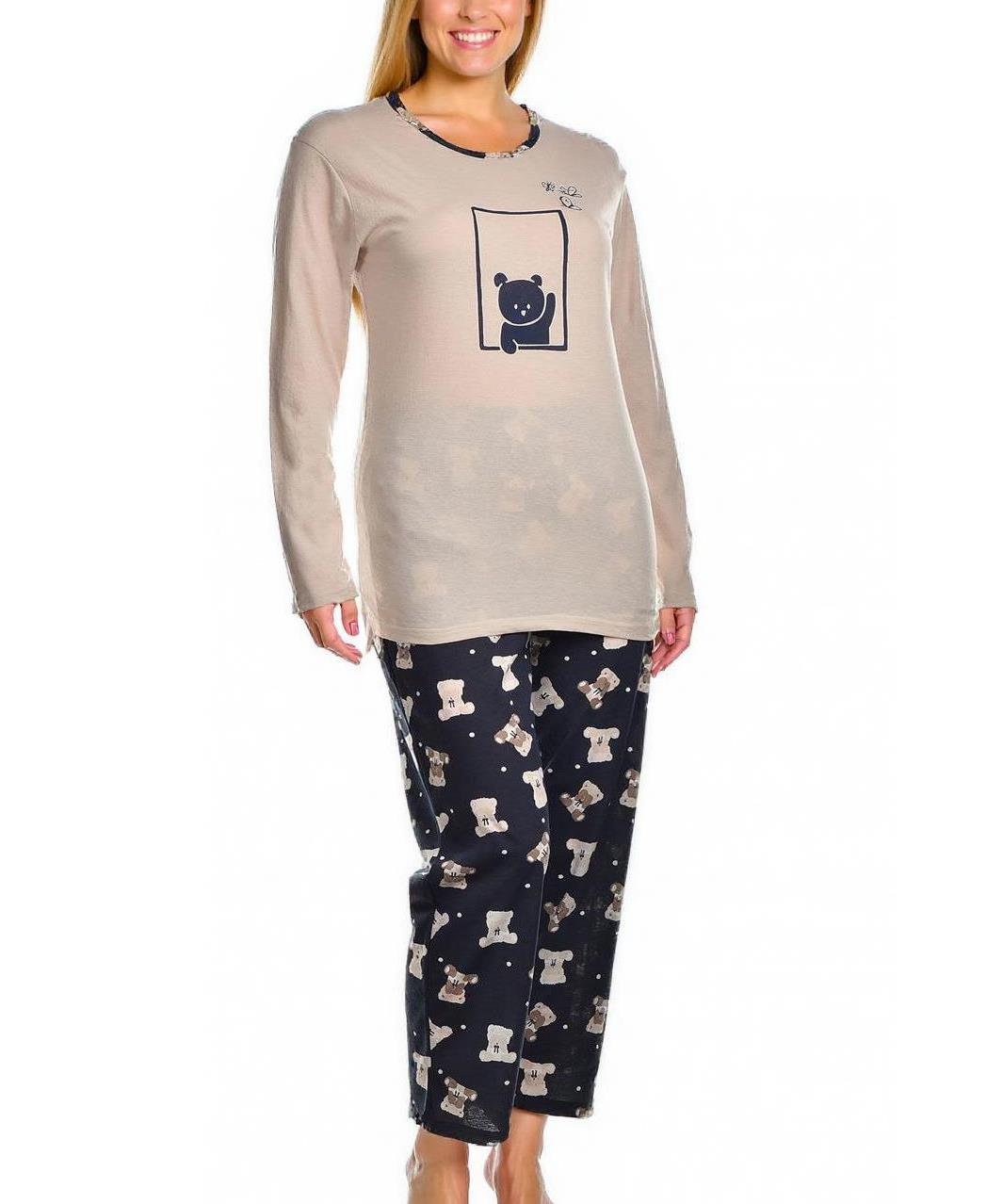 Мека дамска пижама от 100% памук с дълъг ръкав и панталон с принт на мечета. Комфортна и дишаща материя, удобна кройка и нежни цветове - перфектна за спокоен и уютен сън у дома. Лесна поддръжка. вечер