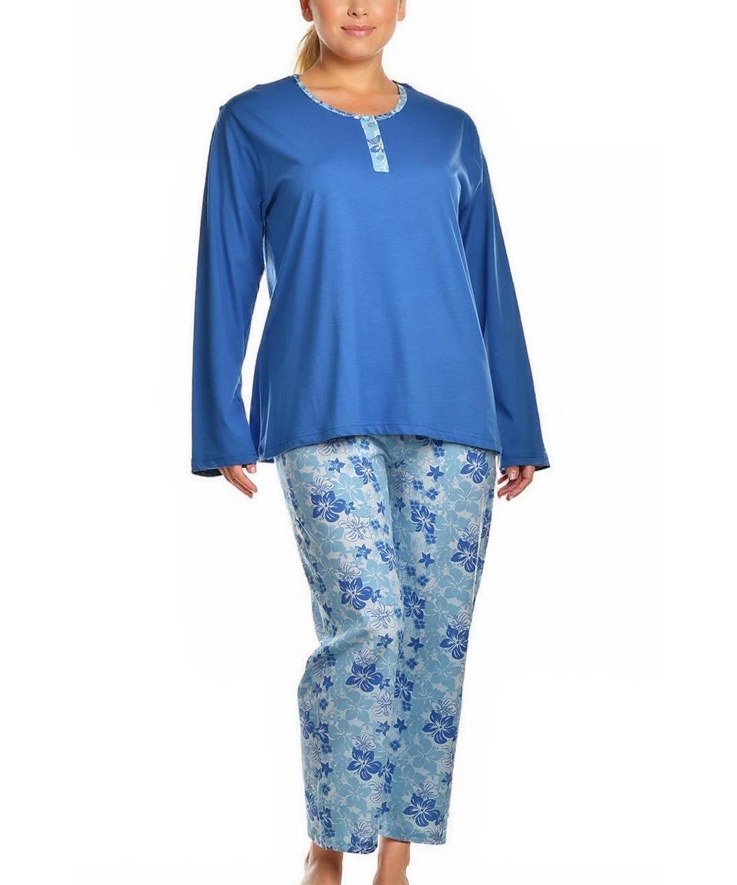 Удобна дамска пижама от 100% памук: дълъг ръкав, декоративно закопчаване на биерата и свободен силует. Долнище с флорален десен, меко и дишащо, идеална за релакс у дома. Налична в размери S-M-L-XL-XXL и др