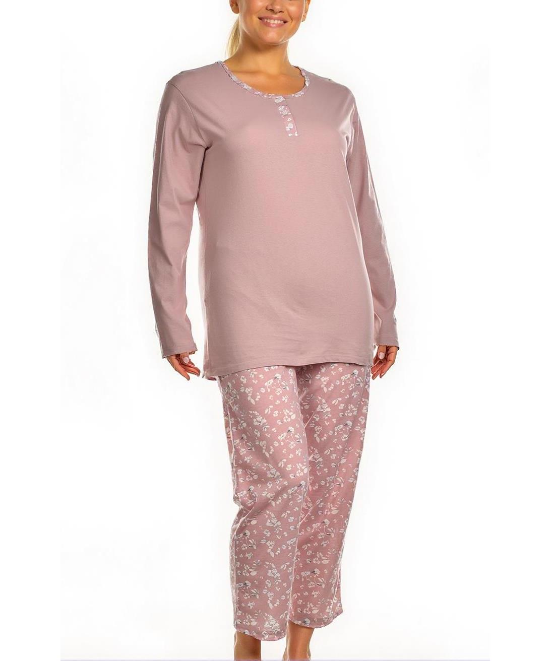 Дамска памучна пижама в мек розов нюанс със свободна блуза с дълъг ръкав и еластичен колан на панталона. Нежен десен на долнището, приятна и дишаща материя за комфортен сън. Подходяща за домашен уют!!