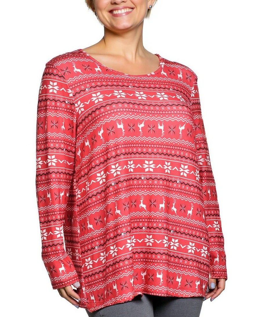 Дамска пижама с горнище с дълъг ръкав в червено, с коледен нордически десен със снежинки и елени. Свободна кройка за комфорт и уют у дома. Комбинира се с едноцветни панталони/клин. Идеална за подарък.