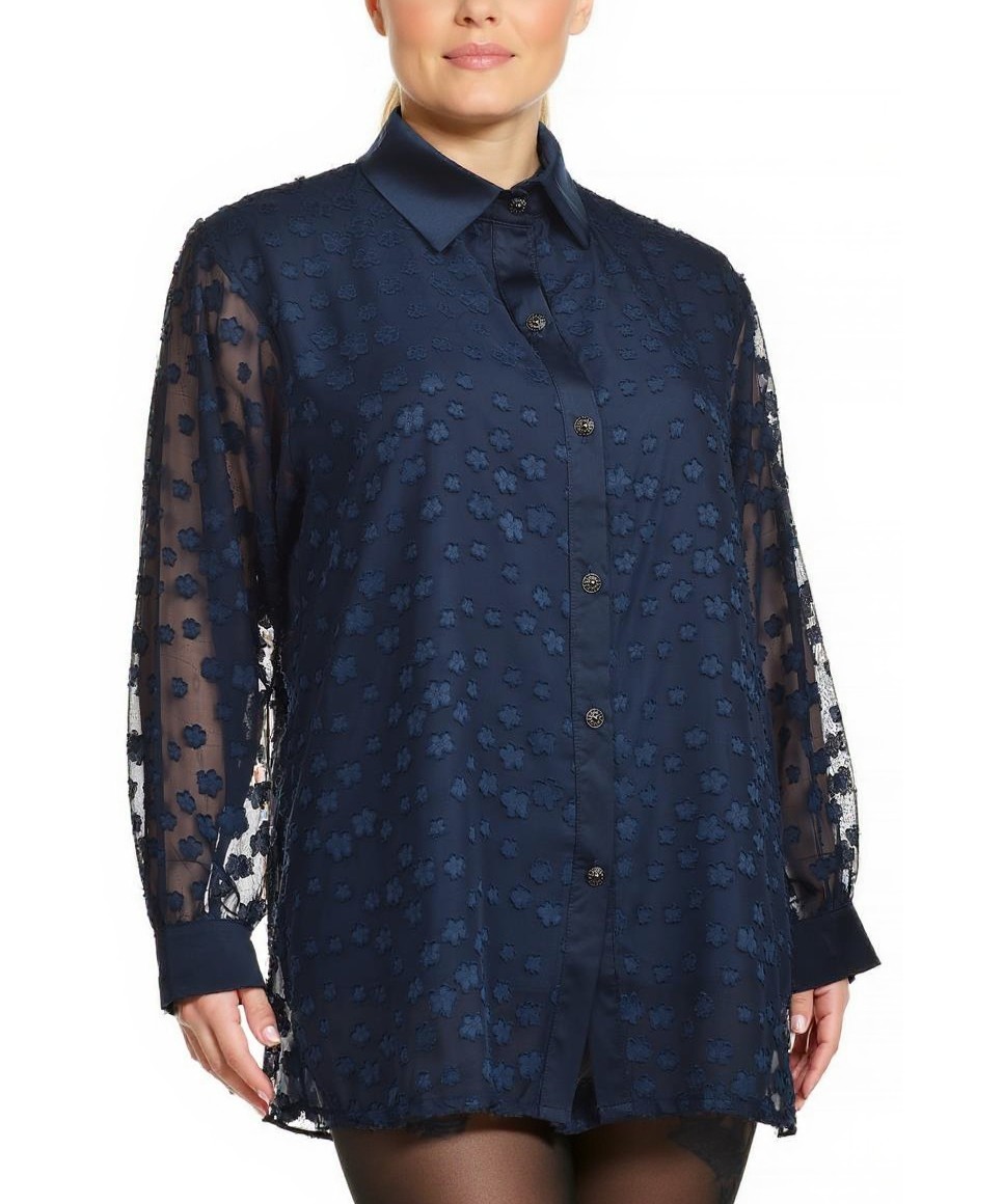 Елегантна дамска риза в тъмносиньо, копчета отпред, полупрозрачни ръкави с релефни флорални мотиви. Свободна кройка, класическа яка и изискан вечерен стил. Подходяща за офис и празнични събития Стилна