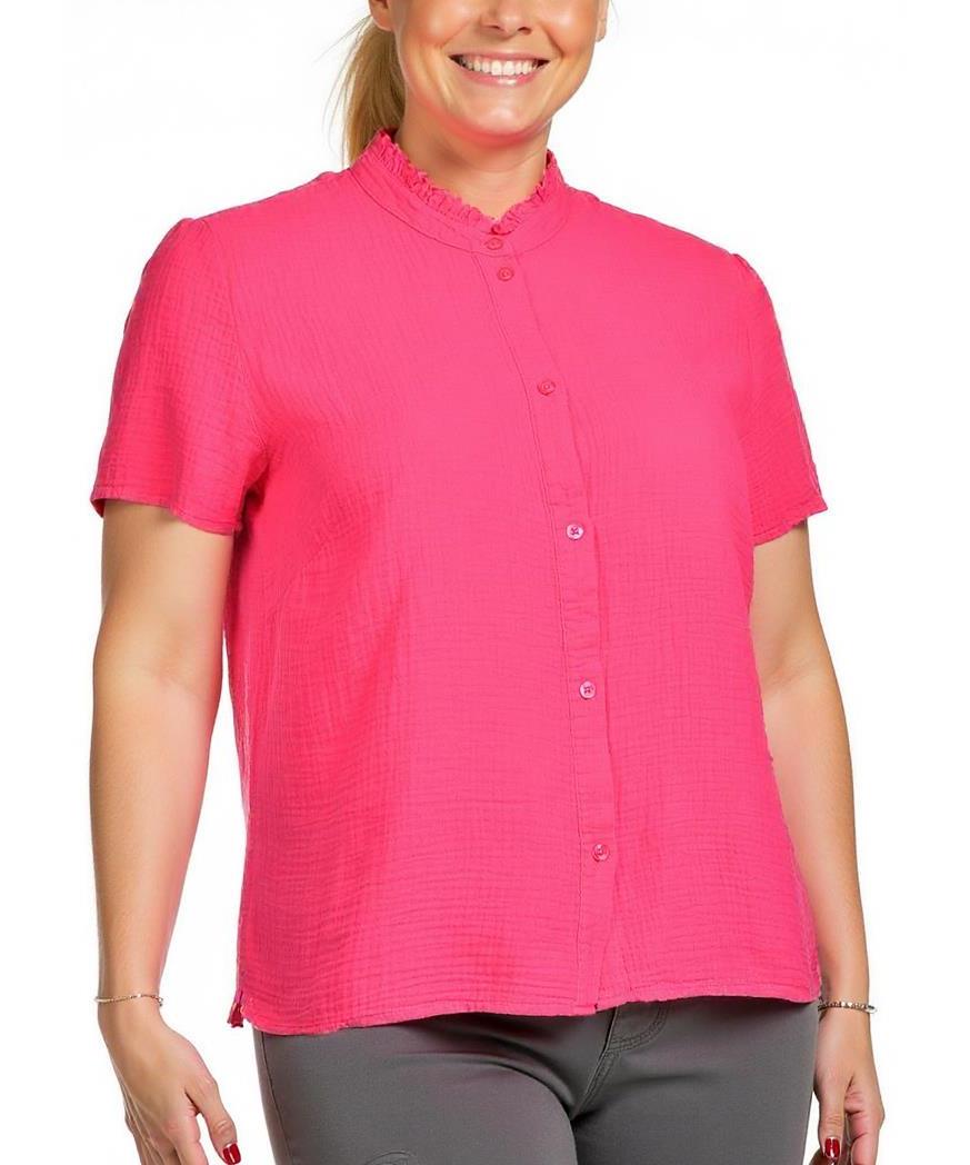 Описание на продукта: Дамска риза от памук в ярко розов цвят. Постепенни ръкави и обло деколте с воланчета. Закопчава се с копчета отпред. Лека и удобна, подходяща за ежедневието и неформални случаи.