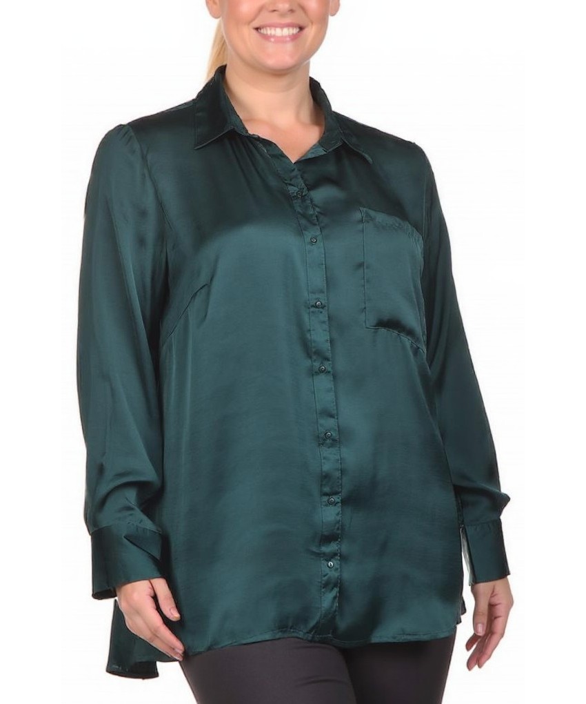 Елегантна дамска риза в дълбоко зелено от бляскав сатен. Свободна кройка с ревер, копчета отпред и джоб на гърдите. Подходяща за офис и официални поводи. Комфортна, лесна за поддръжка. Перфектен избор.