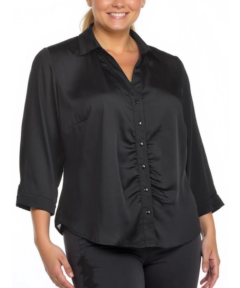 Елегантна дамска риза в черно от лек, сатениран плат. Класическа яка, копчета отпред и деликатно събиране в центъра. Свободен силует и 3/4 ръкави — идеална за офис и вечерни визии. Подходяща за пране