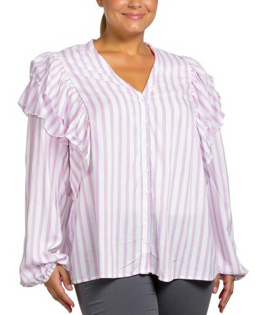 Дамска риза от вискоза с вертикални линии в лилава гама. Оформление с дълги ръкави и къдрици за допълнителен обем. Закопчаване с копчета отпред за удобство и стил. Подходяща за ежедневието.