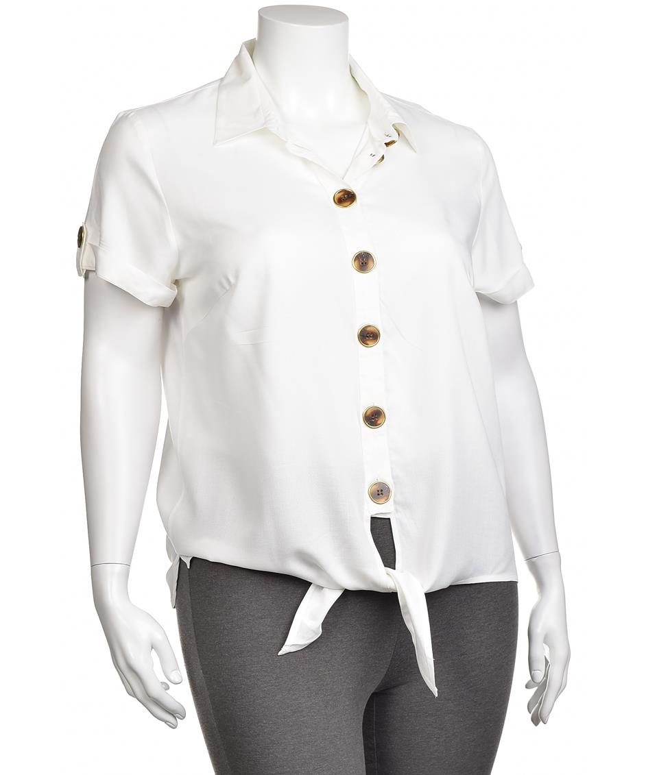 Дамска риза от вискоза с къс ръкав и отворена яка. Разполага с предно закопчаване с големи копчета и декоративен възел за завързване отпред. Идеална за небрежен и стилен външен вид.