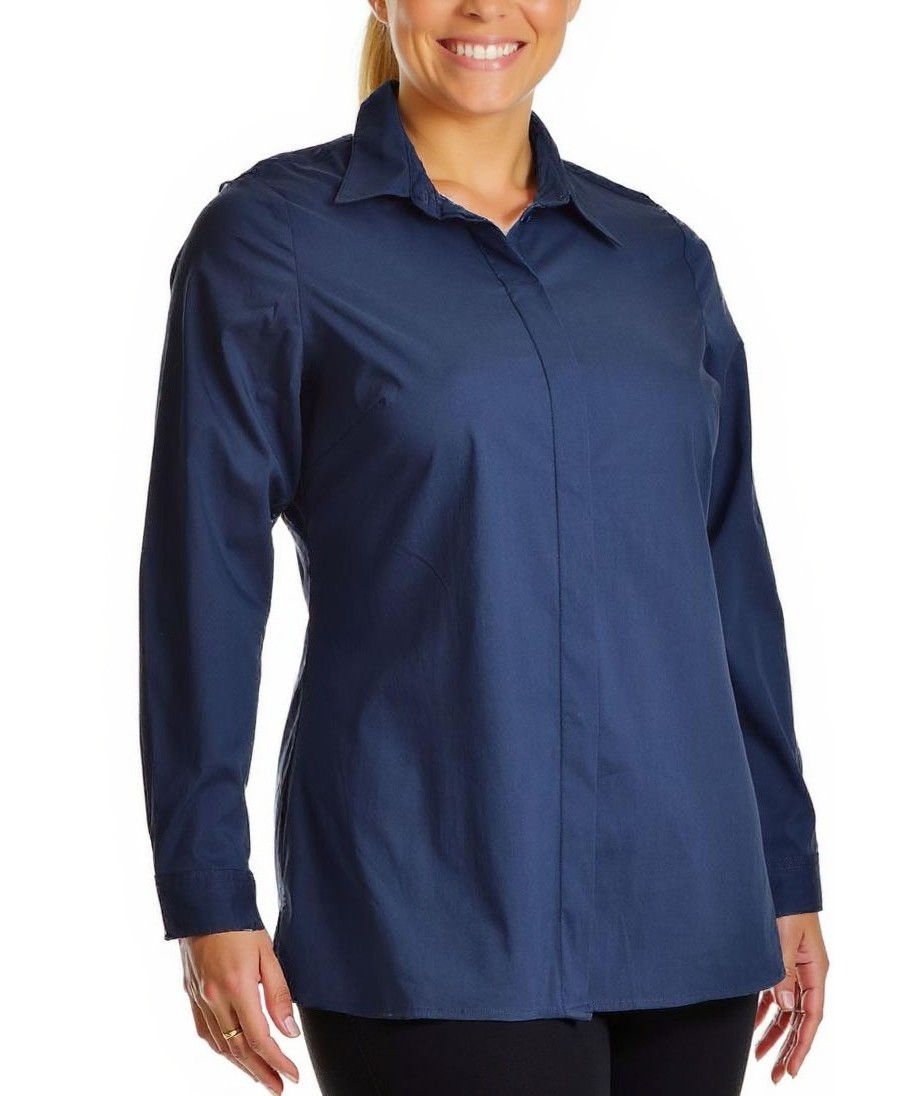 Елегантна дамска риза от 100% памук в тъмносин цвят. Класическа яка, дълъг ръкав и скрито закопчаване. Удобна, дишаща и подходяща за офис и ежедневие. Нежно оформена кройка. Лека и лесна за поддръжка.!