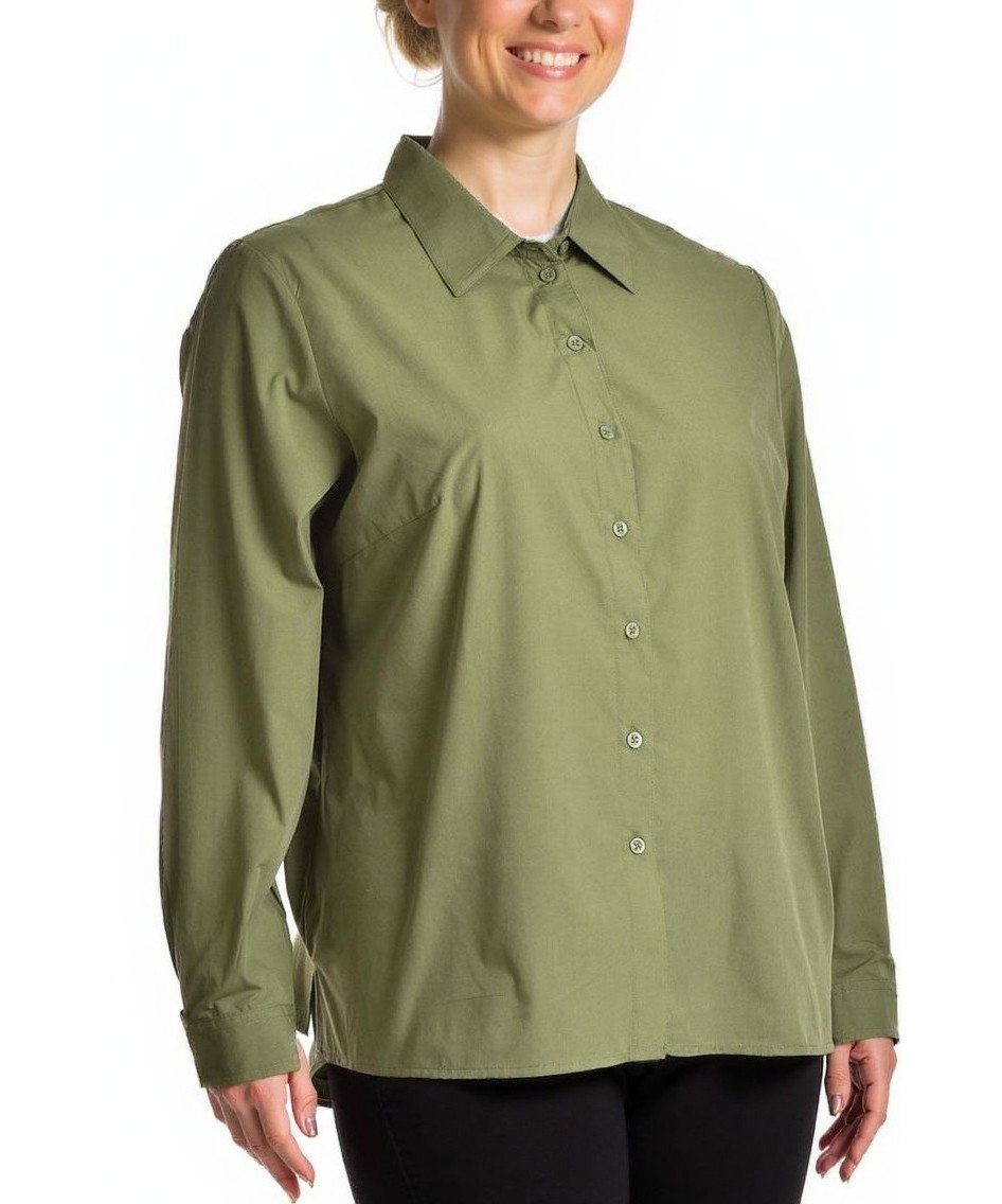 Елегантна дамска риза от 100% памук в маслиненозелен цвят. Класическа кройка с якичка и копчета, дълги ръкави и удобна линия за всекидневно или офис носене. Машинно пране, бързо съхнене. Налични S–XXL