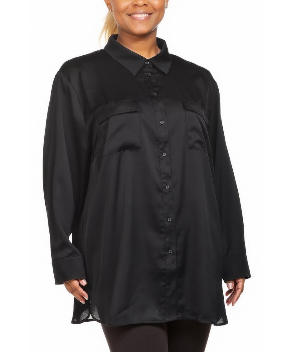 Елегантна черна дамска риза от мек сатен, с копчета по цялата предна част, джобове на гърдите и дълги ръкави. Свободна удобна кройка — подходяща за офис и ежедневни визии. Лека и лесна за поддръжка....