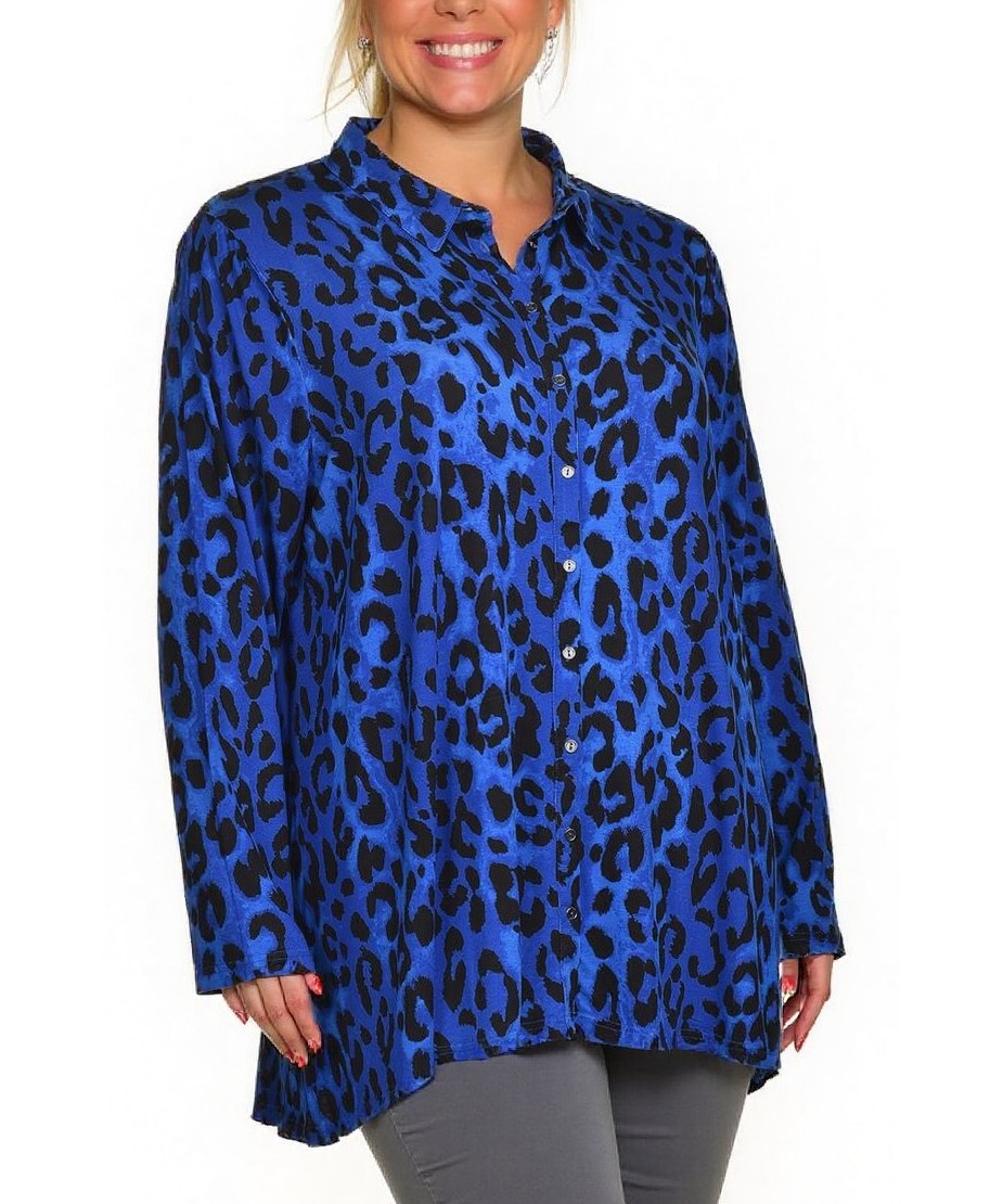 Елегантна дамска риза от вискоза с животински принт в наситено синьо и черно. Свободна кройка, дълги ръкави, копчета отпред и леко удължен заден ръб — стил и комфорт за всеки ден.