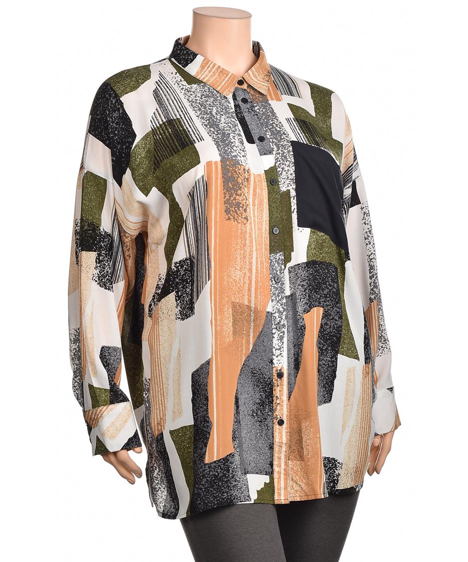Свежа дамска риза от вискоза с артистичен абстрактен принт в зелено, охра, черно и бяло. Свободен силует, копчета отпред и джоб, комфортна и стилна за всеки ден. Подходяща за офиса и свободното време.