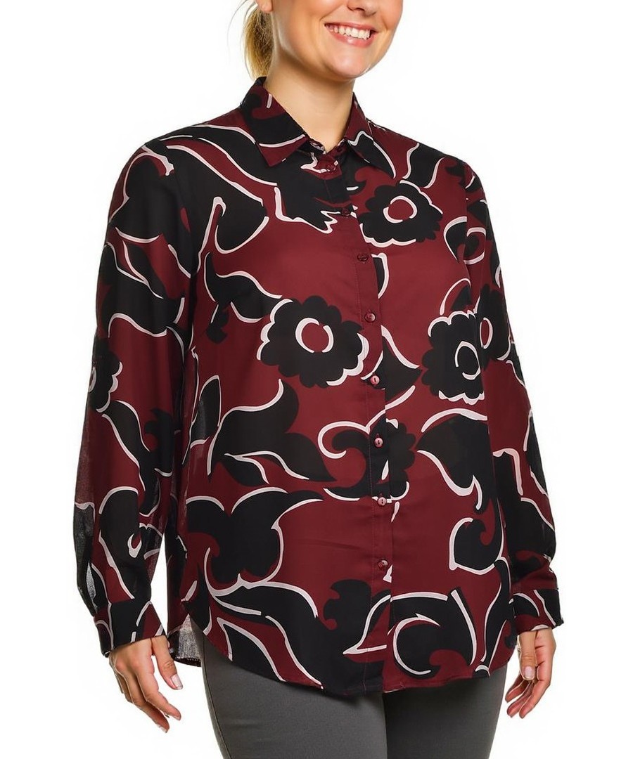 Елегантна дамска риза в бордо и черно с флорален принт, копчета отпред и класическа яка. Лека, ефирна материя за ежедневен или офисен стил. Удобна, свободна кройка. Подходяща с дънки или елегантен пант.